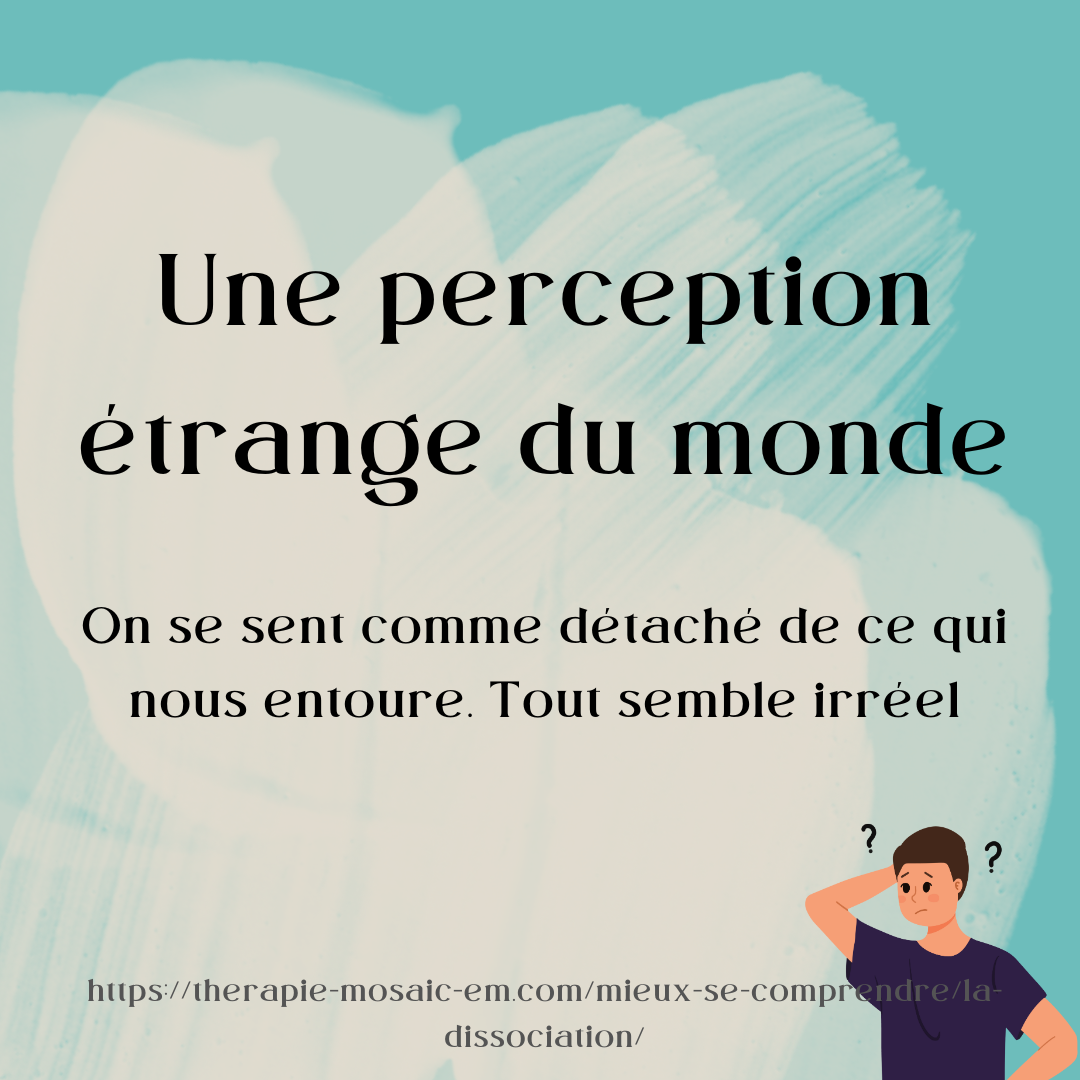 La dissociation peut-être un symptôme de stress post-traumatique. Ce symptôme perdure quand le corps cherche à se protéger du vécu traumatique.